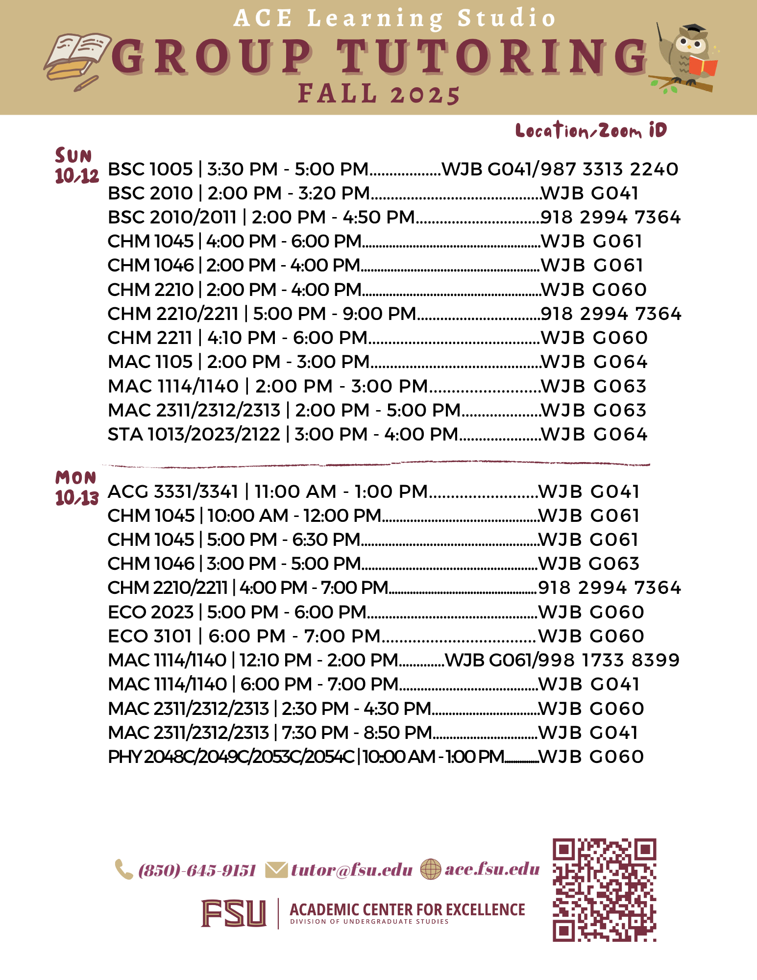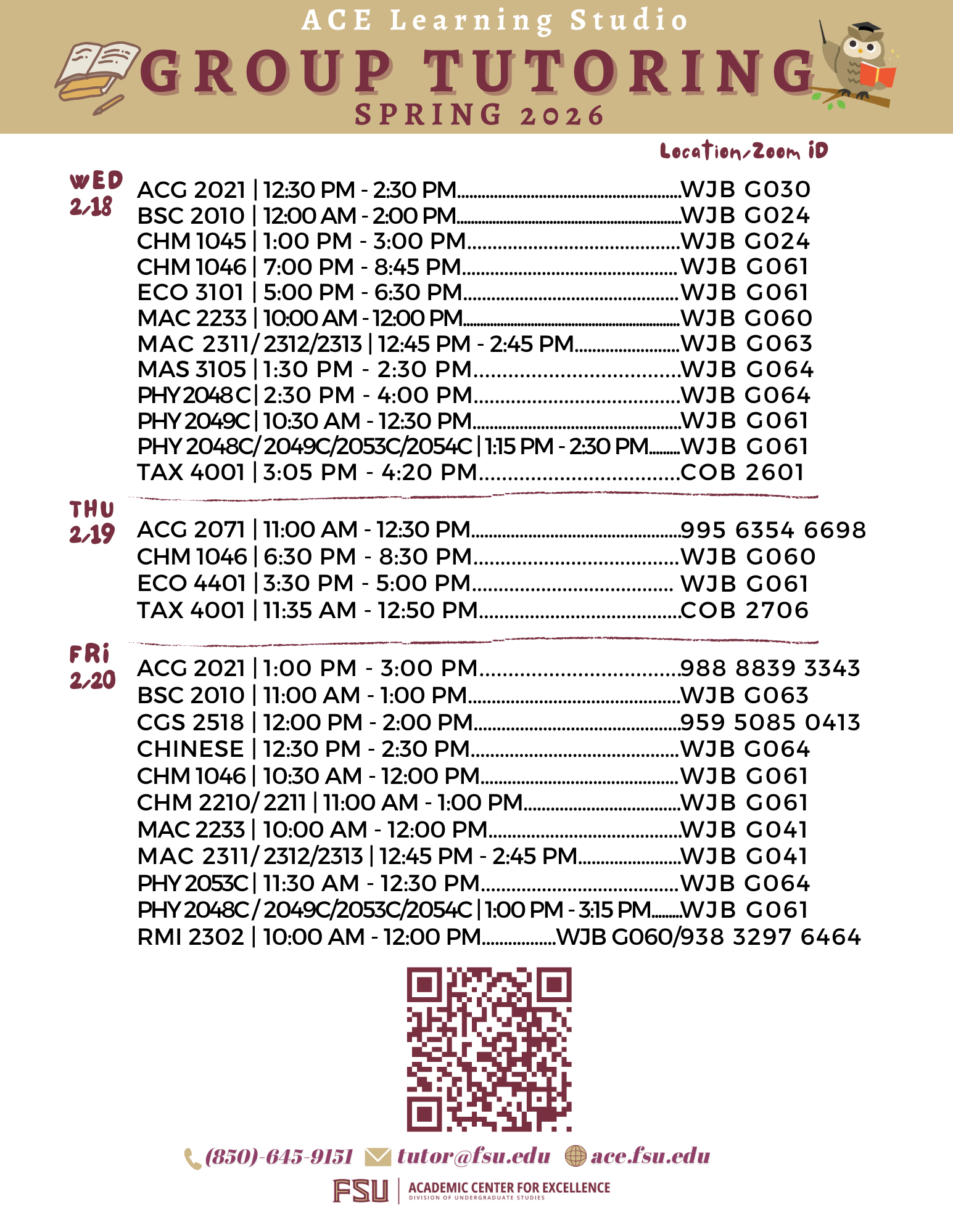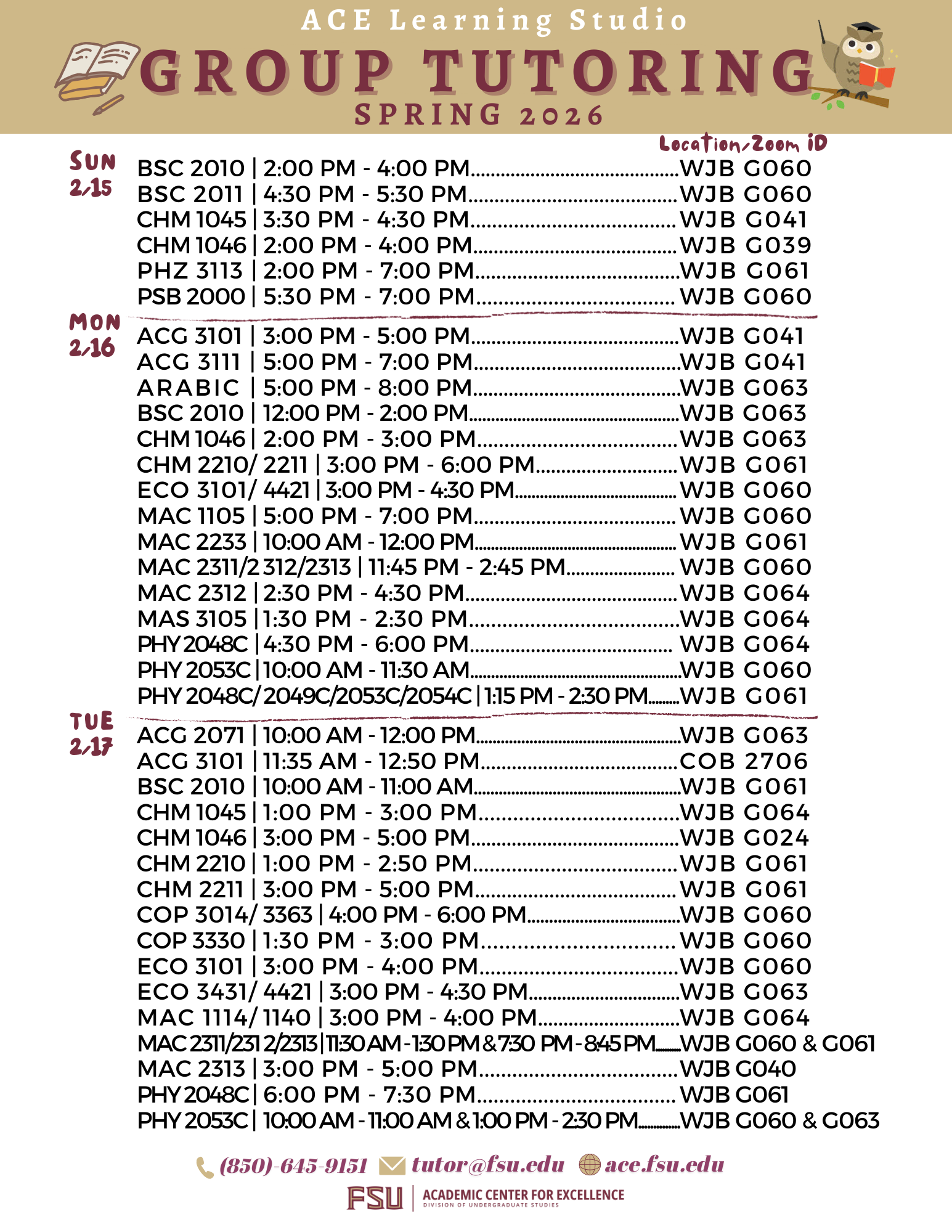 ACE offers Group Tutoring to answer students' questions. Please come prepared with notes and questions. Use your FSU Zoom account to access the virtual sessions. The "Frequently Asked Questions" section below provides more information about our group tutoring. Click here for the schedule in PDF format. Contact us at tutor@fsu.edu with any questions or requests.