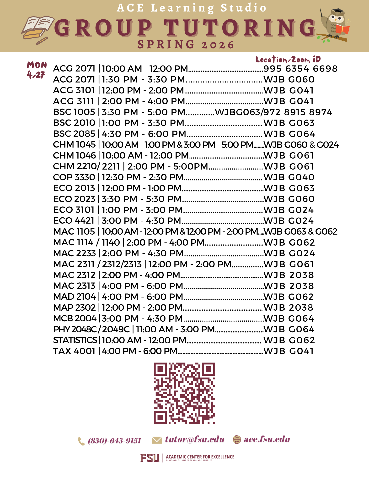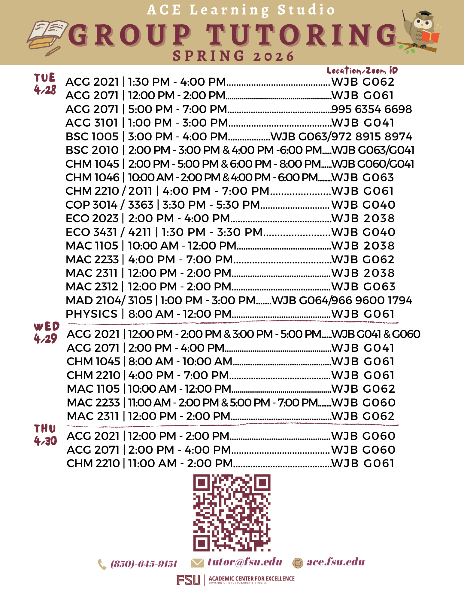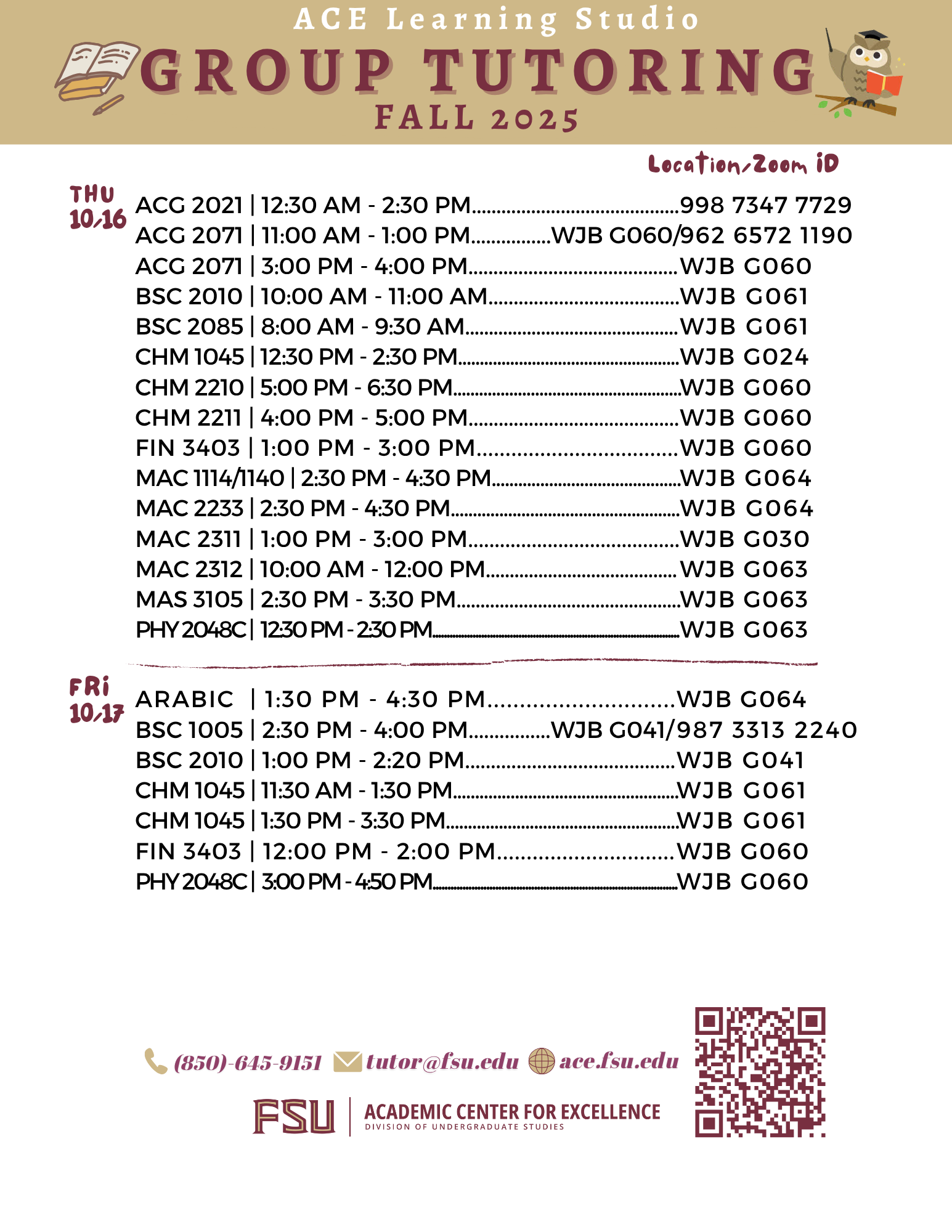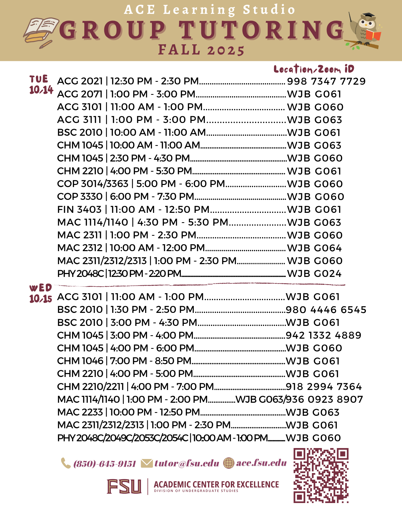 ACE offers Group Tutoring to answer students' questions. Please come prepared with notes and questions. Use your FSU Zoom account to access the virtual sessions. The "Frequently Asked Questions" section below provides more information about our group tutoring. Click here for the schedule in PDF format. Contact us at tutor@fsu.edu with any questions or requests.
